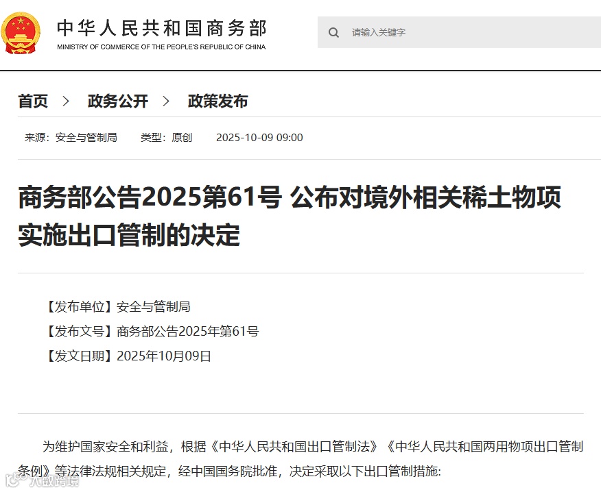 10月3日,美国率先宣布对中国船舶征收额外费用,中国随即采取对等反制措施——不仅对美国船只征收同等费用,更升级稀土出口管制:只要境外制造物项中,源自中国的稀土成分占比≥0.1%,就将被纳入管制范围。