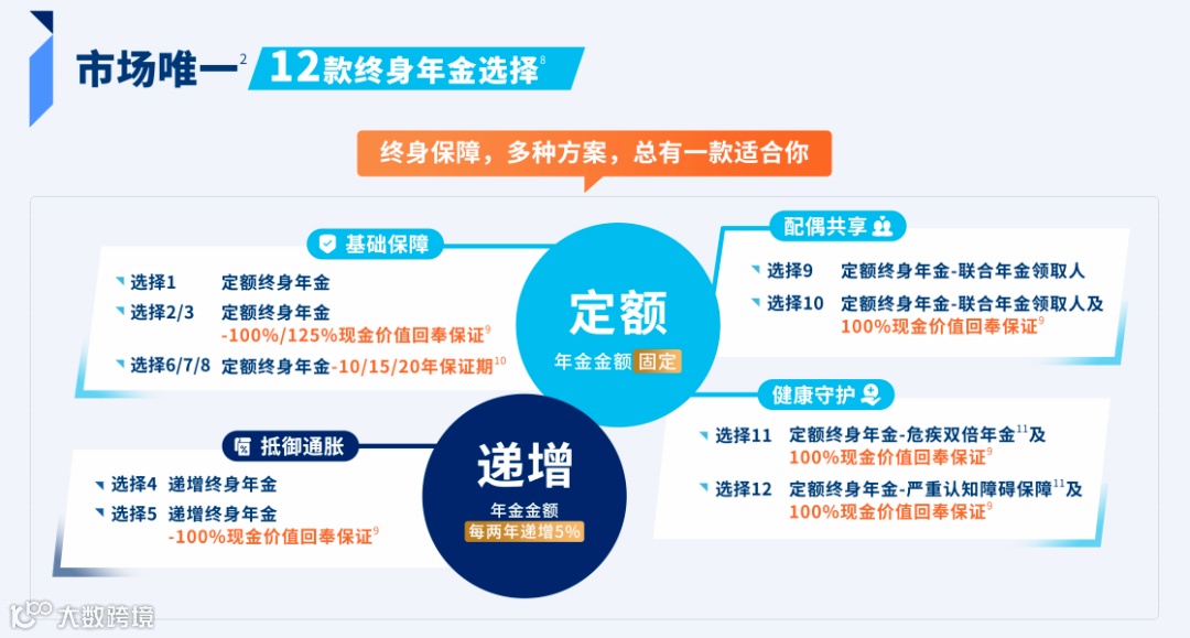 12种领取方式:从基础的终身领取、保证回本领取,到应对通胀的“每2年涨5%”领取,再到适配丁克家庭的“夫妻联合领”(一方身故后另一方仍可领取2/3);