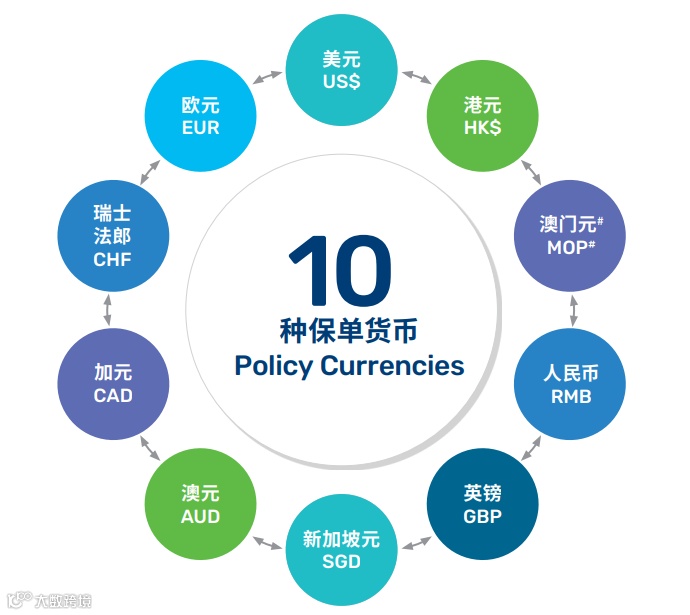 在全球化养老需求日益增长的当下,万通富饶千秋支持10种货币(美元、港币、人民币、英镑、澳元、加元、新加坡元、日元、欧元、瑞士法郎),是港险市场中货币选择最丰富的产品之一,完美覆盖全球资产配置需求。