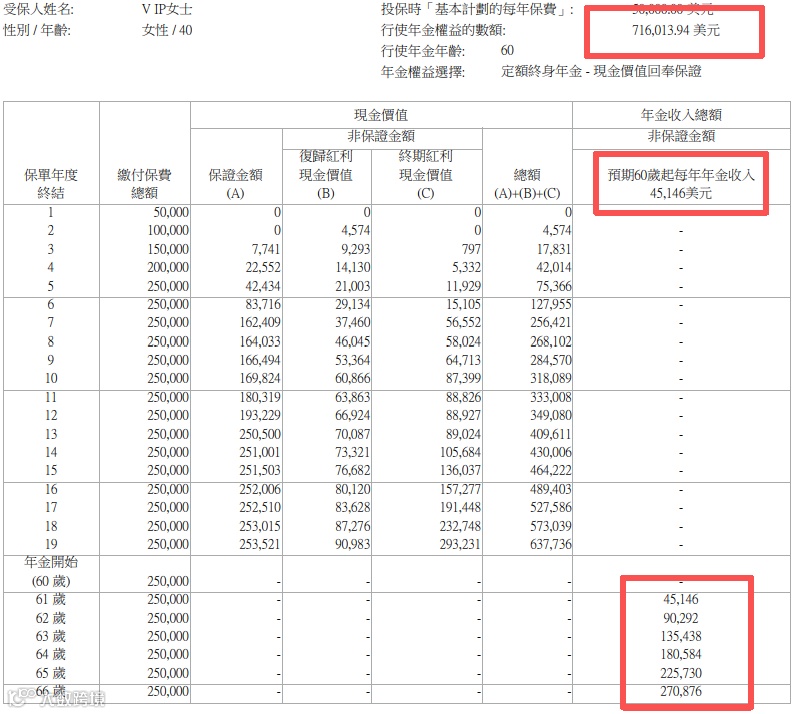 转换后收益:以40岁女性、5万美金分5年缴为例,60岁时保单现金价值达71.6万美金。