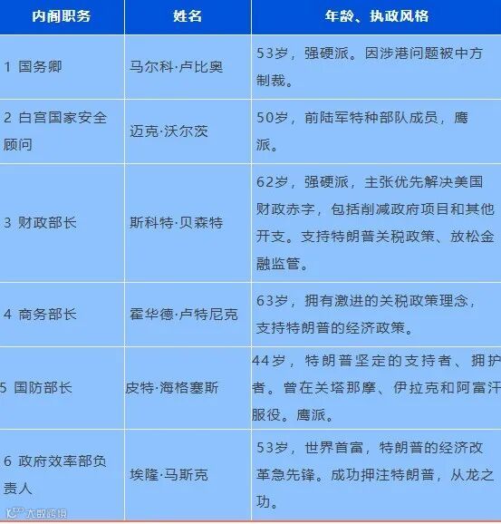 特朗普将聚焦政治改革,完成党内清洗,组建忠诚自己的内阁团队,并清算民主党的前期迫害。尝试打破“深层影子政府”,使美国再次伟大。特朗普自2024年11月6日当选新任总统以来,已经在关键职位上提名一系列鹰派、年轻忠诚的新内阁人选,内阁全面MAGA化。