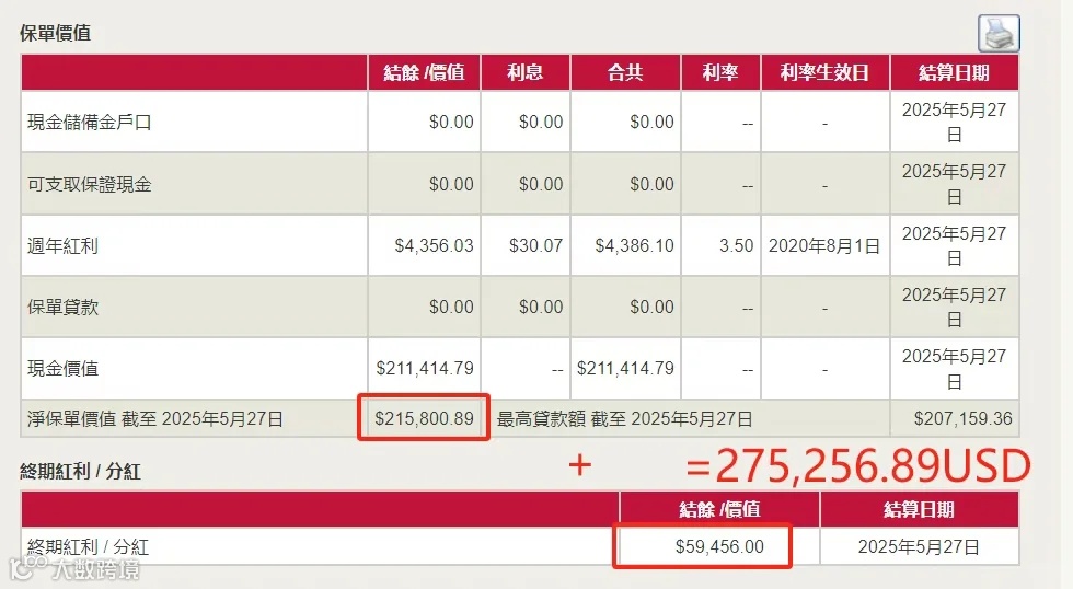 前段时间见面,他翻出今年5月的保单现金价值表,语气里满是庆幸:2016年4月投的20万美金保费,到第9个保单年度,总价值已经涨到275256.89美元,算下来实际复利收益达3.61%。