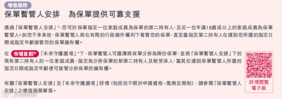 传承功能创新:投保人可指定暂管人,身故后暂管保单;暂管人能分拆保单并指定新受保人,实现类信托管理。