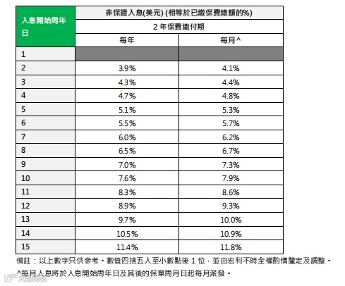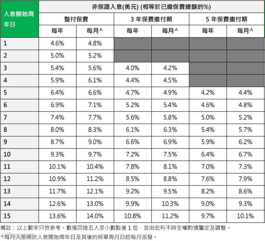 整付保费:两种选择,一是第2年起每年提领总保费5%至终身(即“125提领”),二是第4年起每年提领6%至终身(即“146提领”);