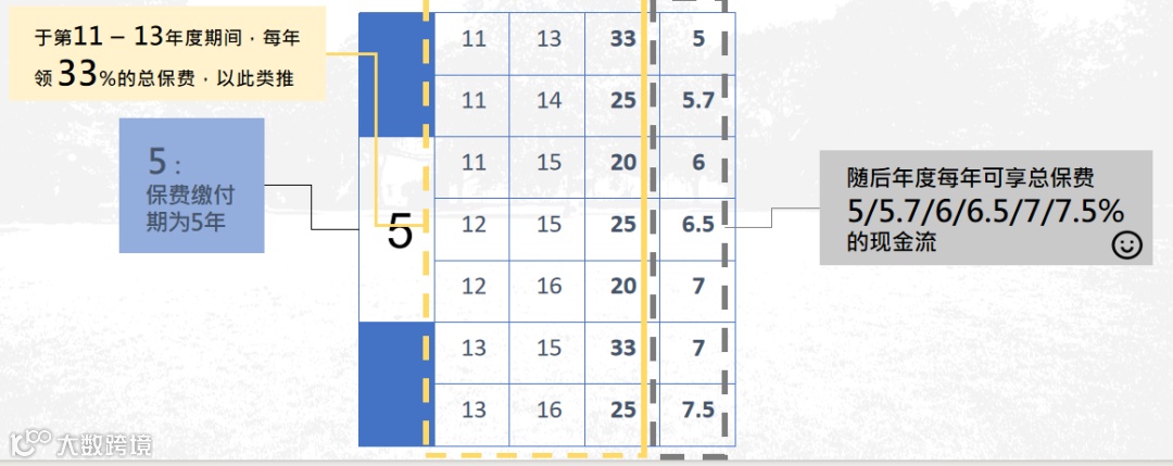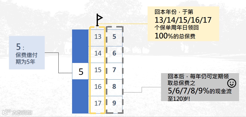 5年缴费模式下,第13年可领回100%总保费,后续每年提总保费5%至终身;
