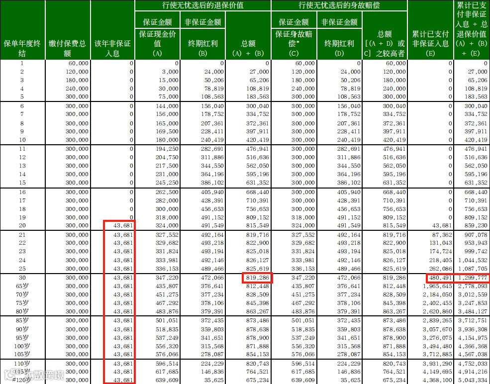 先双倍回本,后终身提领:对应“5/20/5.8”提领方案,5年缴费的前提下,第20年可领回2倍本金,第21年起每年提总保费5.8%至终身。