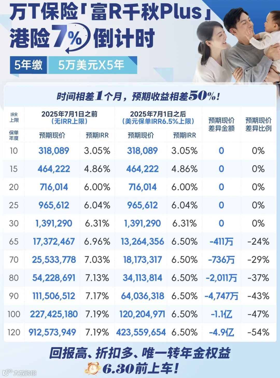 - 万通-富饶千秋plus:5万美元5年交(总保费25万美元),预期收益差4.9亿。