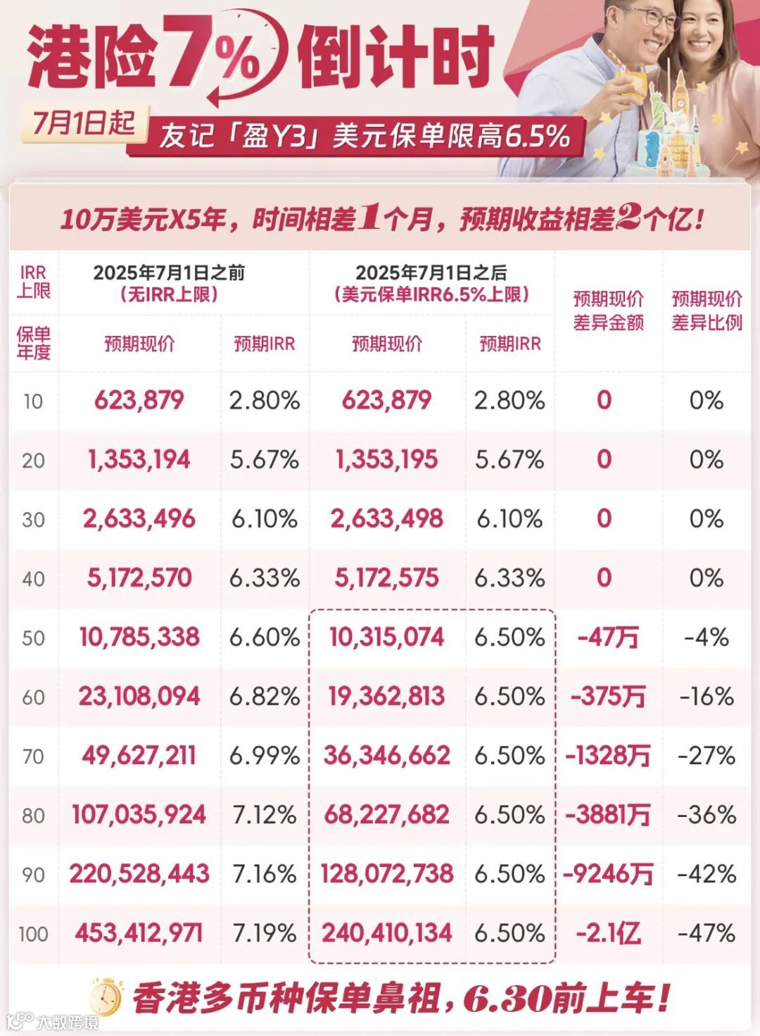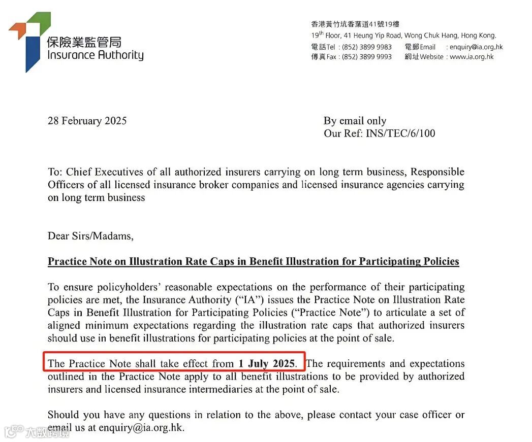 香港保监局发布《分红保单利益演示利率上限指引》,将对香港分红险演示利率设限。2025年7月1日起,港元保单演示利率上限为6%,非港元保单(如美元保单)为6.5%。