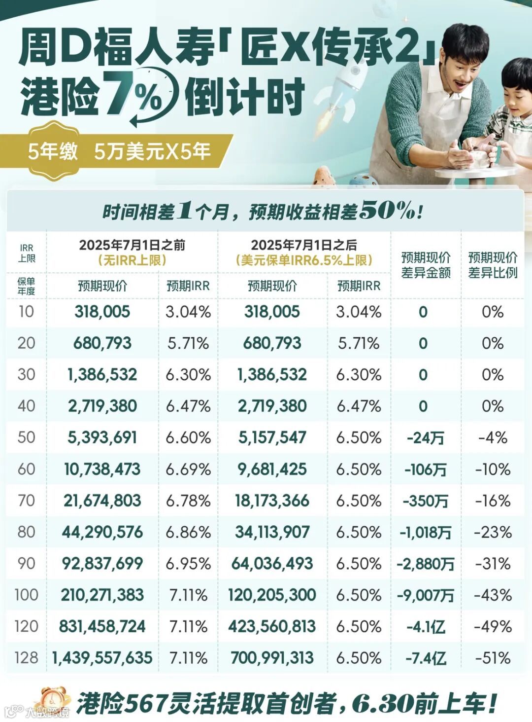 - 周大福-匠心传承2:5万美元5年交,预期收益差7.4亿。