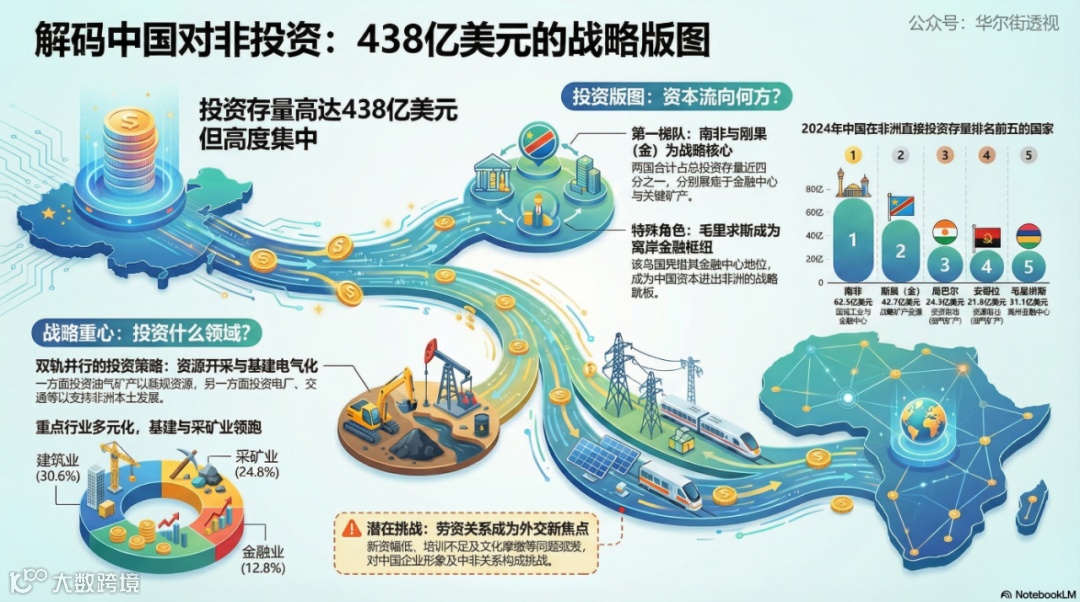中国在非洲438亿美元的投资存量并非平均分配,而是呈现出高度集中的地域格局,清晰地反映了资本的战略逻辑与风险暴露程度。非洲的投资存量可以划分为三个梯队: