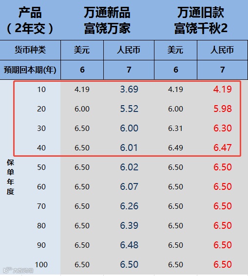 核心原因在于“保费锁定的利率周期”不同。当下是美元高息周期,“富饶千秋2”的保费,能大概率配置到票面利率5%左右的长期美债——100块保费,未来二三十年每年能稳定拿5元利息;