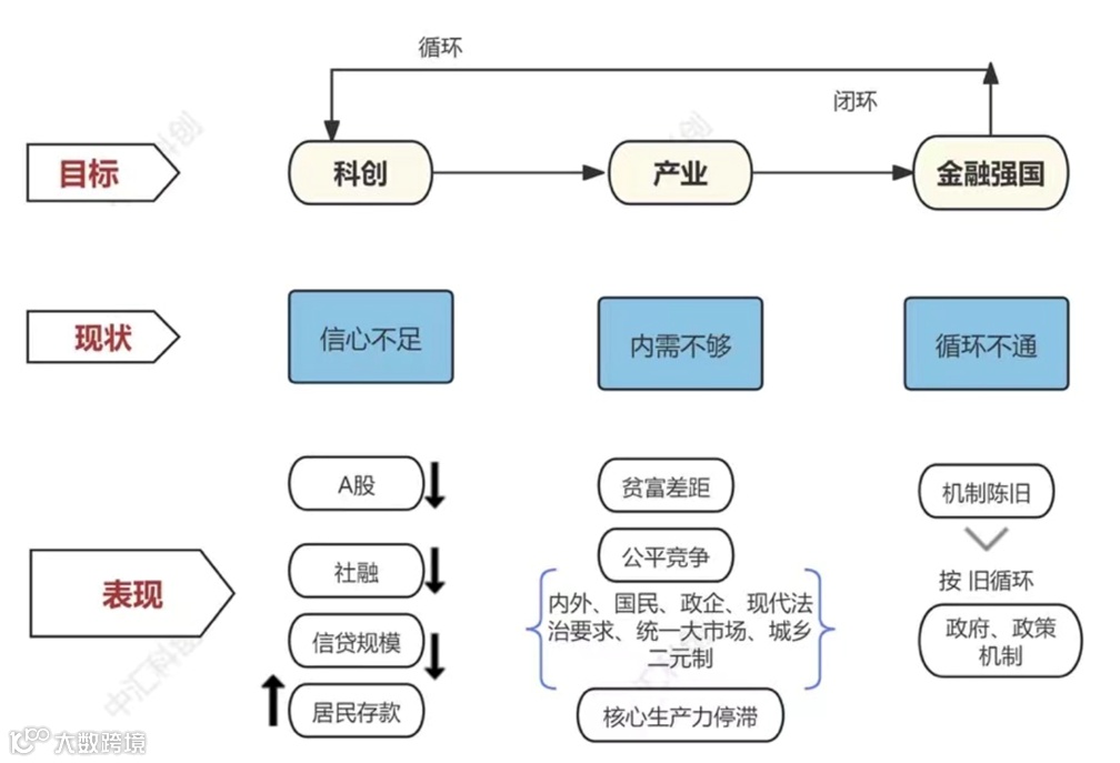 从上图我们可以看出,国家构想的目标是很完美的。中央引导金融转向科创,用科创带动产业,从而实现中国产业在本轮经济周期中的转型升级。但现状和表现出的数据却跟当初的设想不太一样。