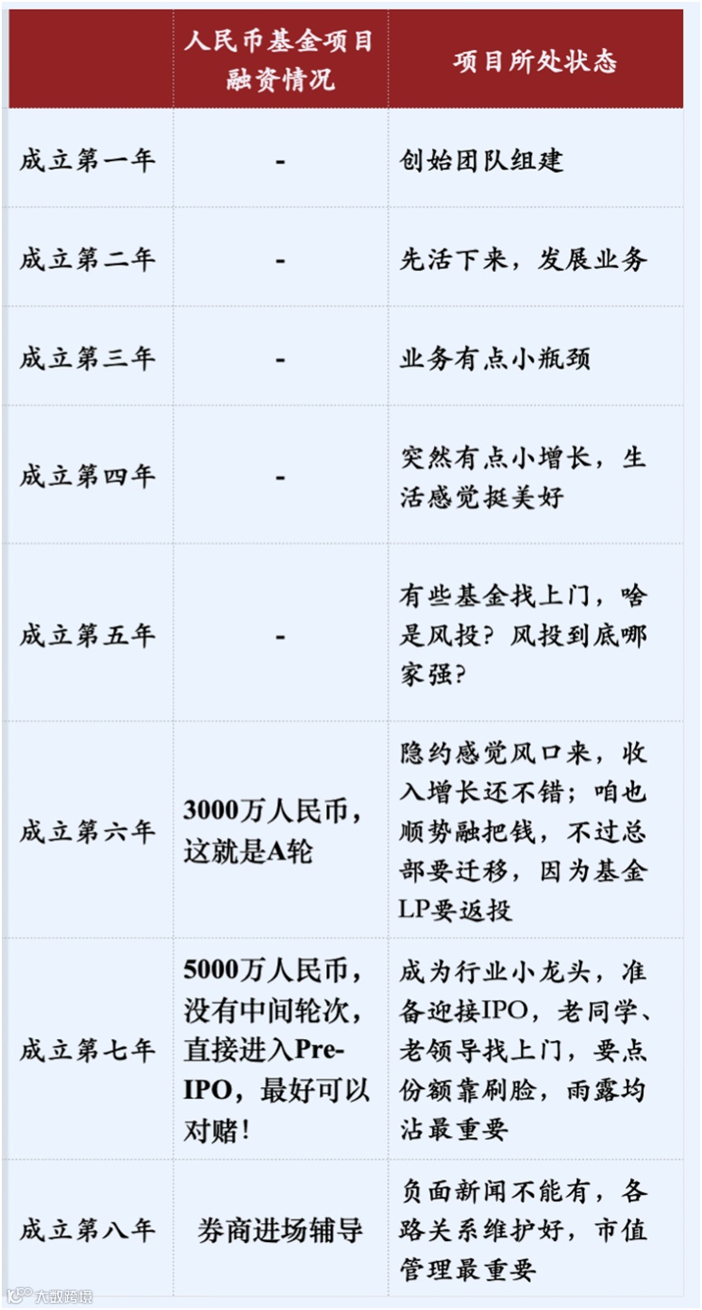 上图是中国本土创业公司融资的一个缩影,一般一个中国企业,在成立5-8年才迎来真正意义上的第一笔投资,这才是常态。