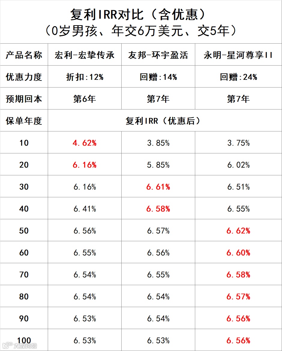 40年+:直接登顶收益榜首,峰值复利IRR达6.62%,彻底扭转无优惠时的平淡态势。