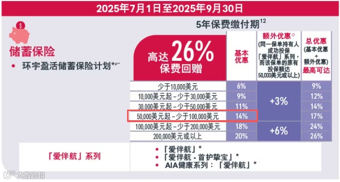 优惠力度对比:永明星河尊享II给出24%的保费回赠,几乎是友邦环宇盈活(14%)、