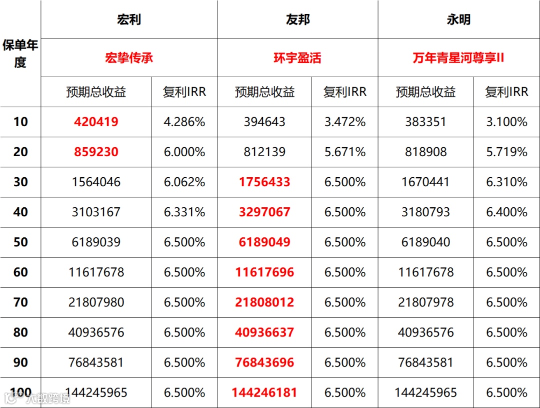 前20年:宏利宏挚传承表现最突出,10年复利IRR达4.28%,20年进一步升至6.00%,显著领先另外两款;