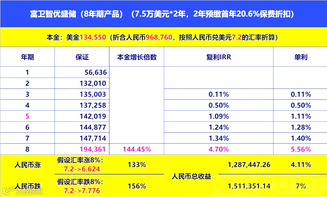 以一款8年期美元固定收益产品为例:13.46万美元的初始投入,8年后将增长至19.44万美元,表面看年化复利达4.7%,单利更是高达5.56%。但这个数字的背后,藏着汇率的"乾坤大挪移"。
