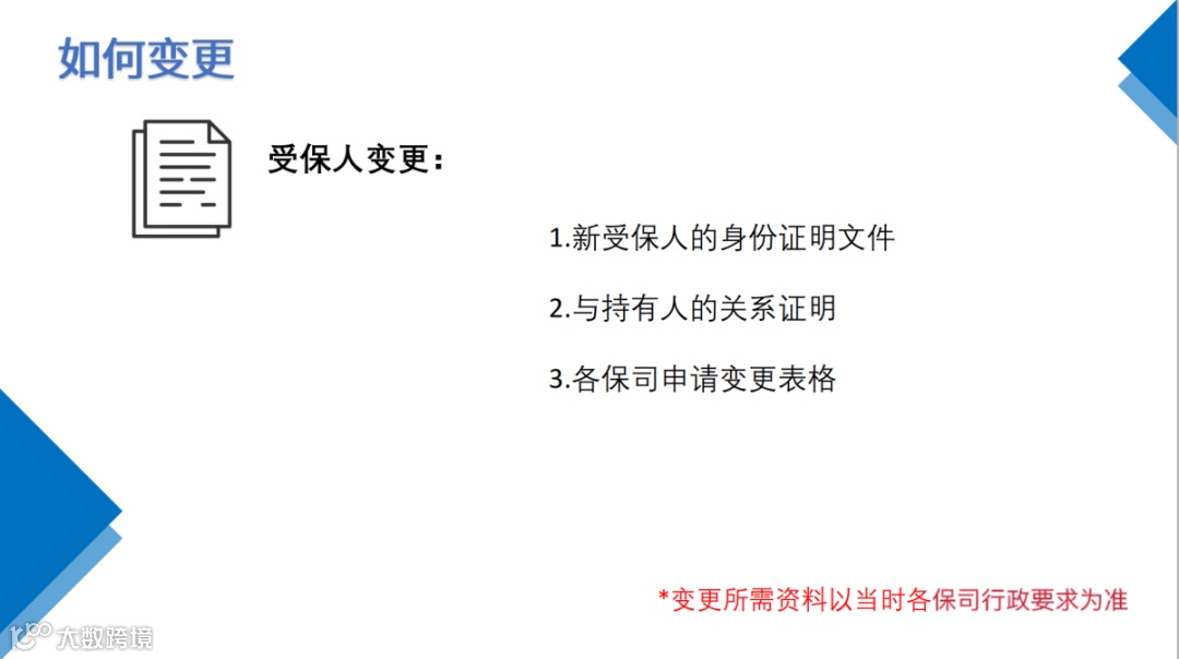 与内地保险不同,香港保险允许变更被保人——保单生效满1年,投保人可将被保人变更为直系亲属(配偶、子女、父母),或有可保利益(如雇佣、合伙关系)的非亲属。