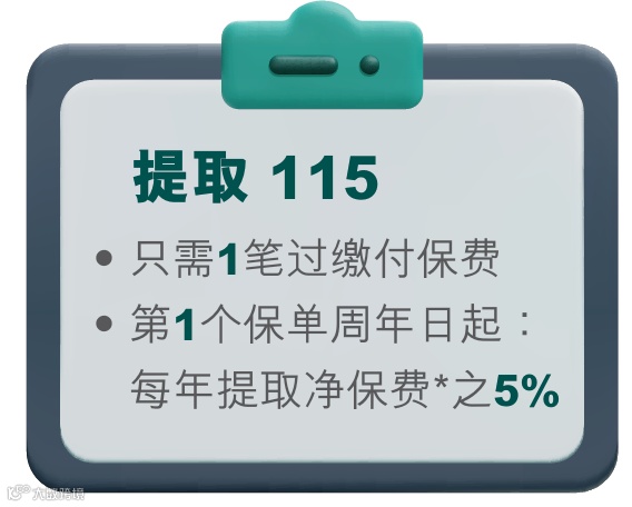 提取灵活:采用“115”提领方式,一次性缴清保费后,从第1个保单周年日起,每年可提取净保费的5%,满足流动性需求。