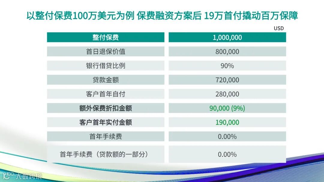 以100万美元保单为例,个人仅需支付19万美元,剩余81万美元由银行贷款覆盖,大幅降低初始资金压力。