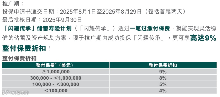 即日起至2025年8月31日,一次性缴付保费达100万美元及以上,可享9%保费折扣。优惠后,首年自付比例低至19%: