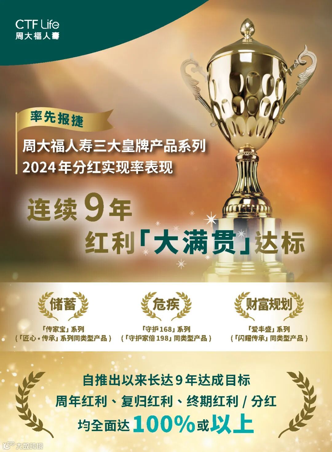 周大福人寿旗下三大王牌产品(传家宝、守护168、爱丰盛)已连续9年实现100%分红达成率。