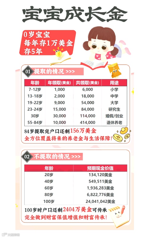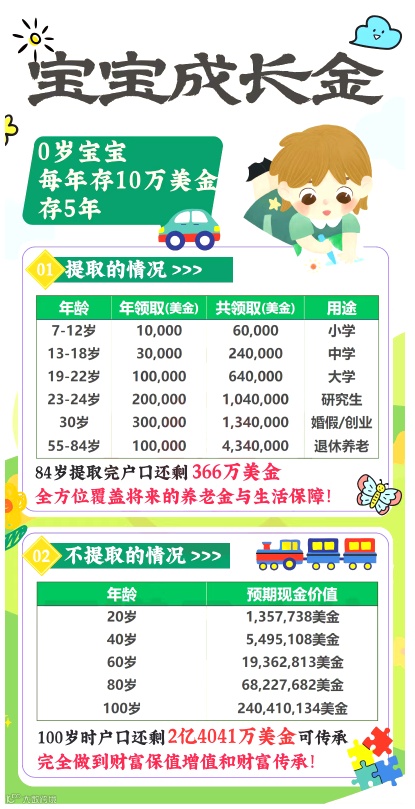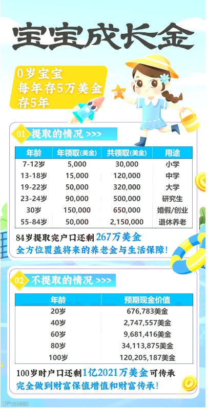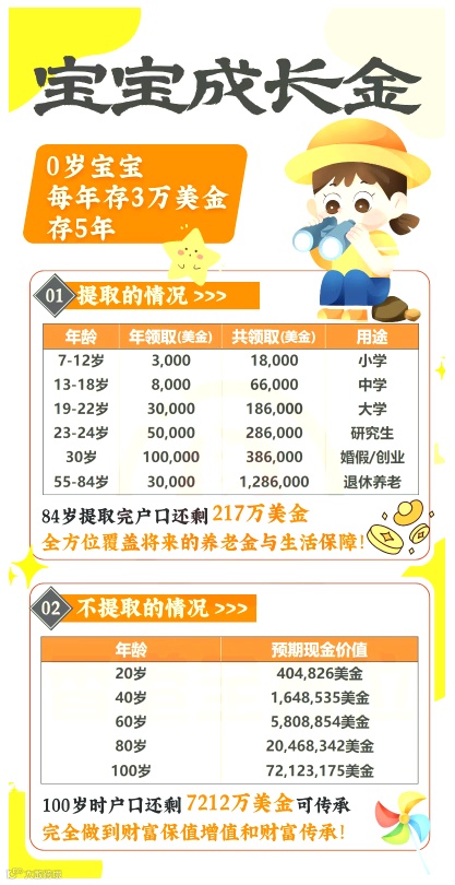 多个缴费方案(如1万、3万、5万、10万美金分5年缴)能打造贯穿一生的稳定现金流,提取后余额可传承或自由支配。