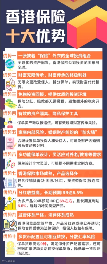 2. 全球资产配置,分散风险:依托香港国际金融中心地位,保险公司投资全球优质资产,分散风险,让投保人分享全球经济红利。