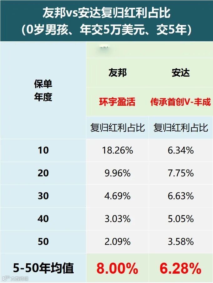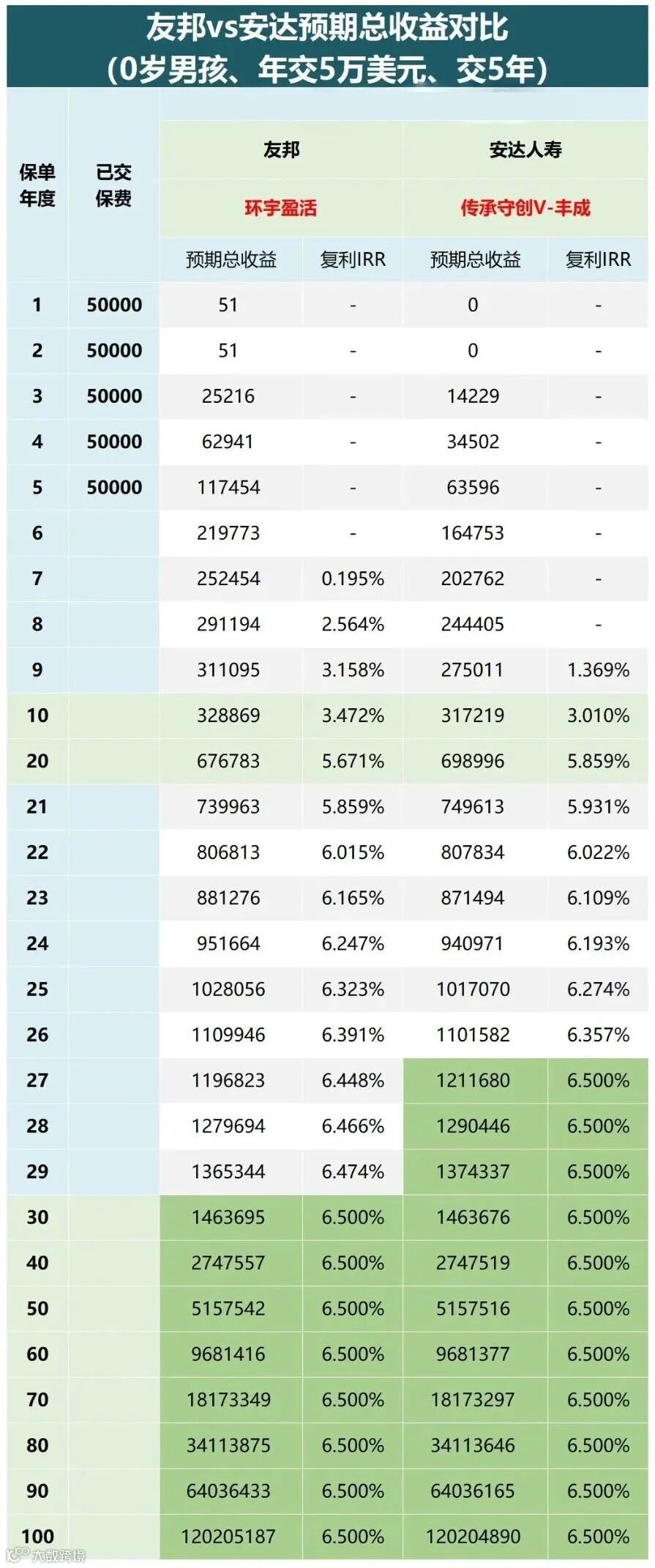 30年及以后:友邦在第30年达到6.5%,而此时安达已稳坐收益上限3年。若持有超30年,两款产品的长期收益趋于一致。