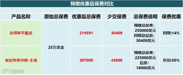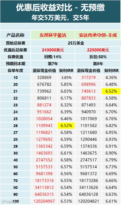 安达传承守创的首年保费直接享有50%折扣,原本5万美金的年缴额只需缴2.5万美金,相当于首年就少交2.5万美金,前期资金压力明显减轻。