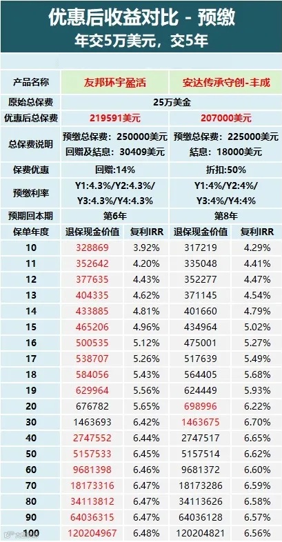 前10年:友邦环宇盈活稍占上风。第10年时,友邦预期总收益32.8万美金,复利IRR4.05%;安达为31.7万美金,复利4.01%,差距微乎其微。