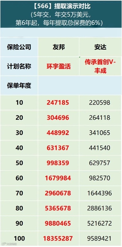 按照566方案(第6年起每年提领总保费的6%,即25万美金总保费每年提领1.5万美金)测试,友邦环宇盈活的抗提取能力更胜一筹,各阶段提领后的账户余额均大幅高于安达。