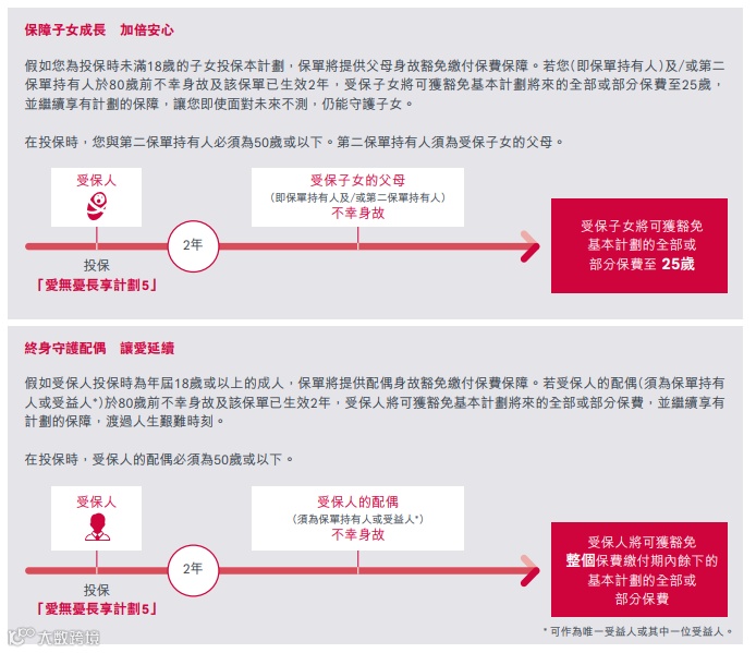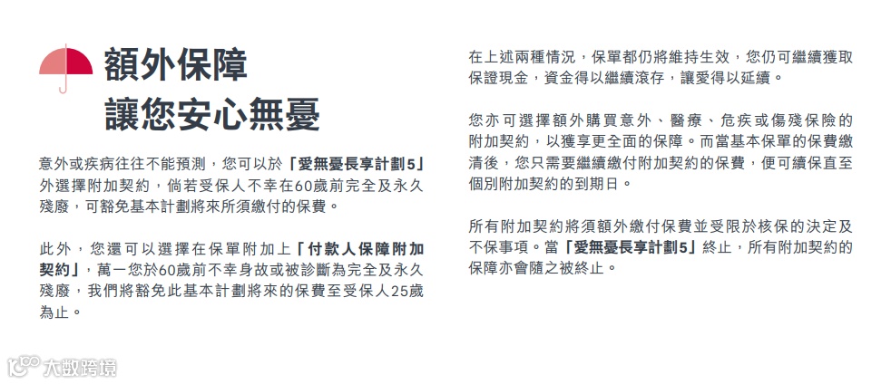 “爱无忧长享计划 5”提供多种附加契约,确保全面保障。若受保人在60岁前完全及永久残废,或投保人不幸身故、残废,可豁免保费。此外,该计划还允许按需购买意外和医疗保险等附加契约,以增强保障。