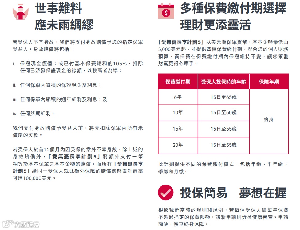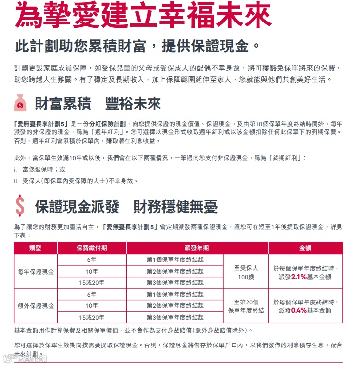 1、财富稳健增长:“爱无忧长享计划 5”作为一项分红保险计划,提供保证现金价值增长。