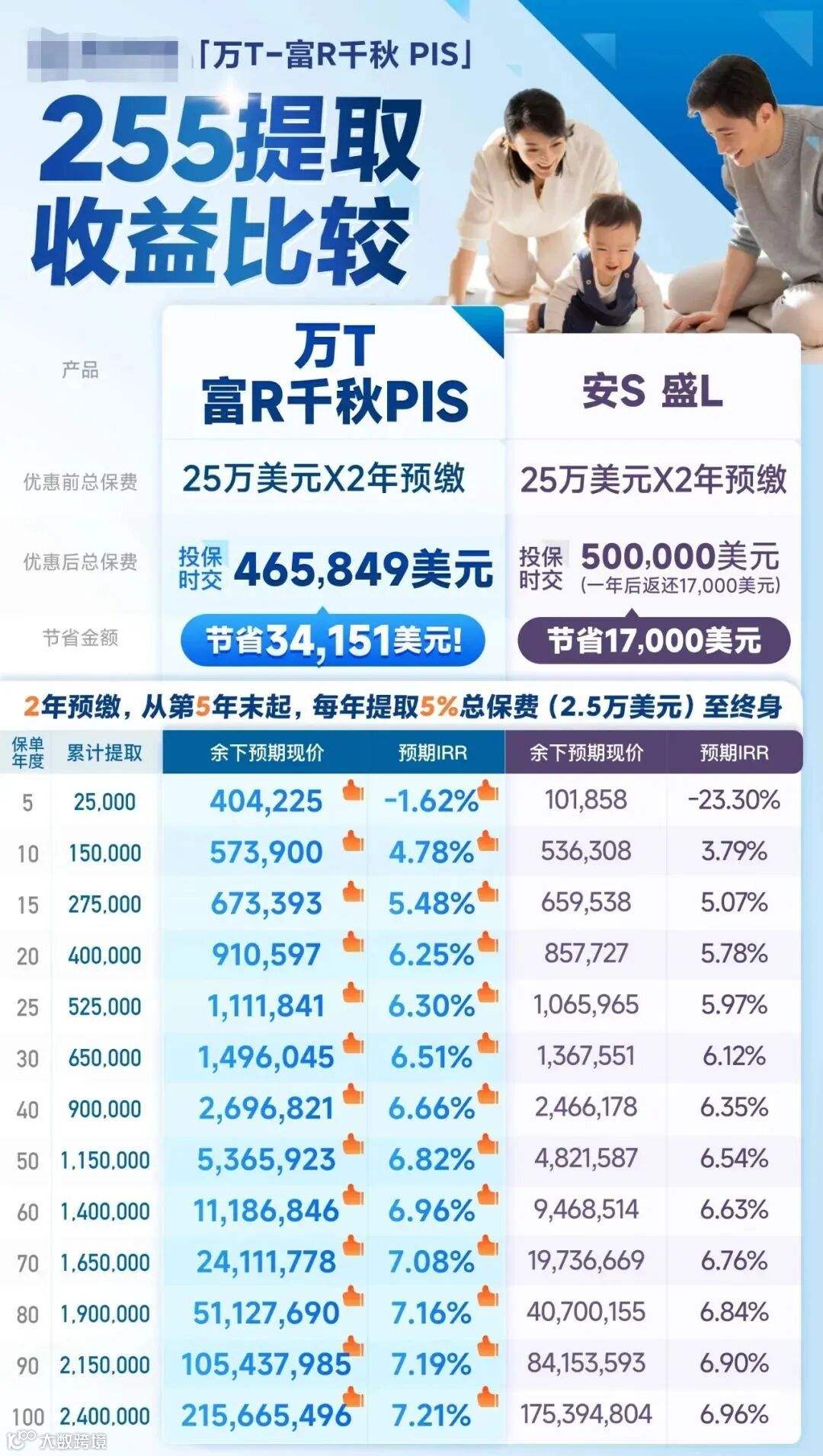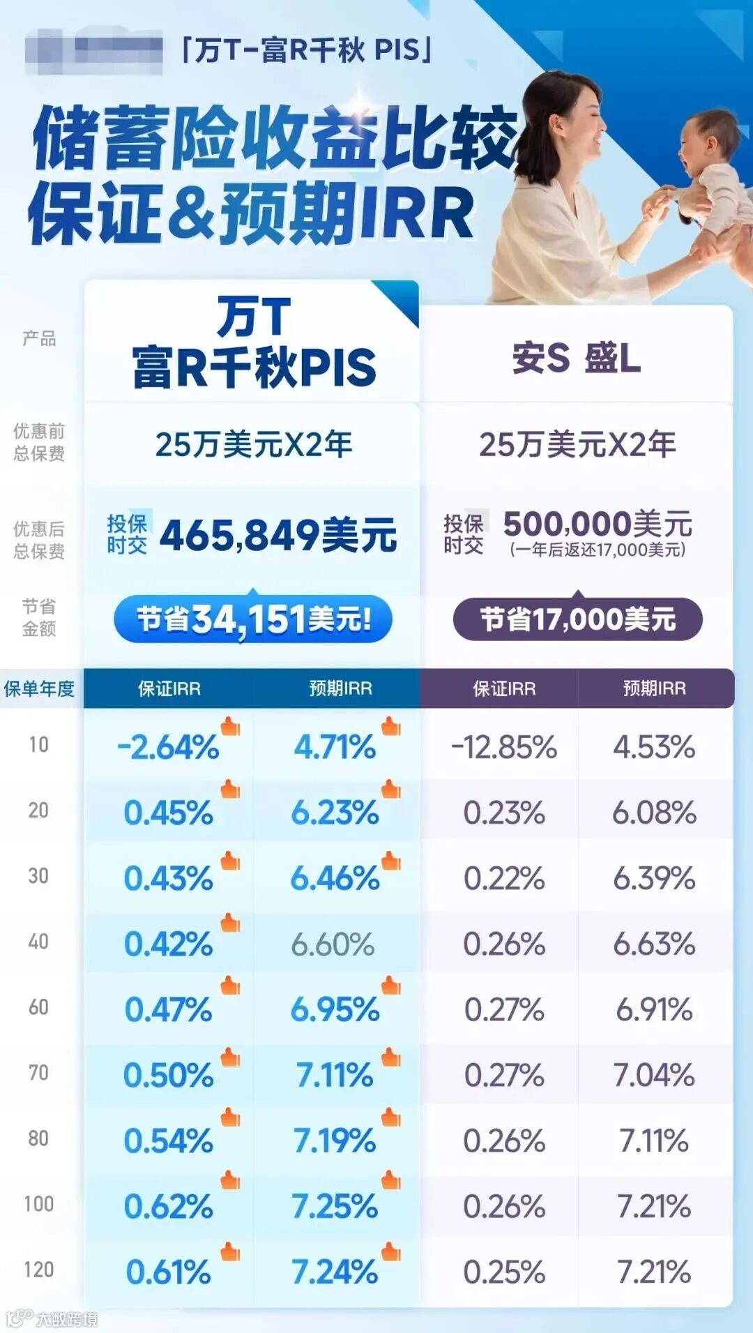「富R千秋PIS」保险计划收益率领先,两年缴款预期收益7.21%,优惠后达7.24%,IRR和预期回报超「盛L」产品。