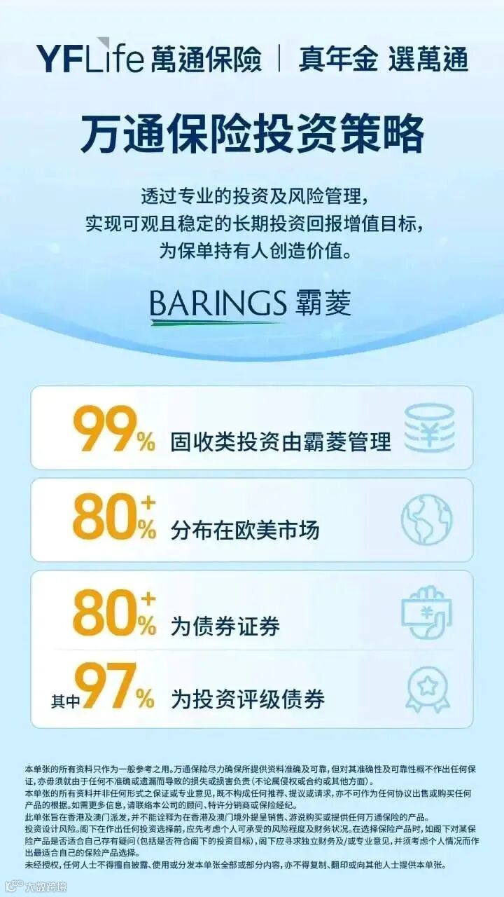 万通保险以专业寿险资管为优势,依托霸菱(Barings)管理其99%固收类投资,其中80%以上为债券证券,97%为投资评级债券。霸菱的全球资管能力为万通保险提供保障。