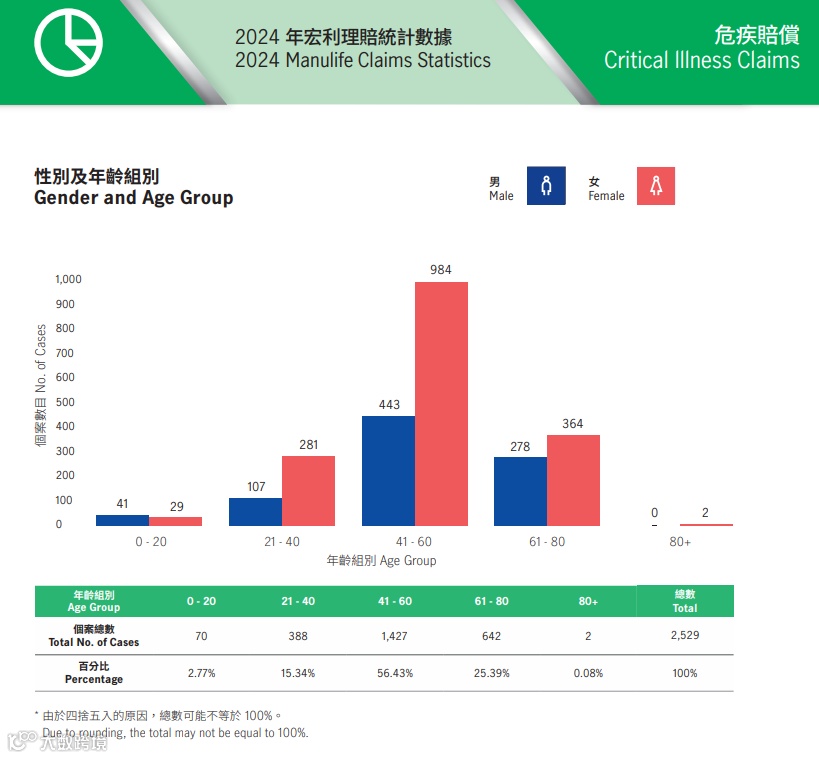 宏利2024年理赔数据显示:2529宗重疾理赔中,40岁以下人群占比17.11%,41-60岁人群更是高达56.43%。无论职场新人还是事业骨干,健康风险带来的经济压力都不容忽视。