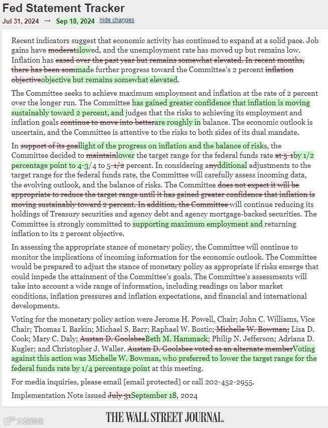 美联储理事米歇尔·鲍曼(Michelle Bowman)对周三的决定持不同意见,支持降息幅度较小,为四分之一个百分点。鲍曼于 2018 年被唐纳德·特朗普(Donald Trump)任命为美联储理事,成为自 2005 年以来第一位反对利率决定的理事。这是自 2022 年 6 月以来利率制定委员会中任何投票者首次持不同意见。
