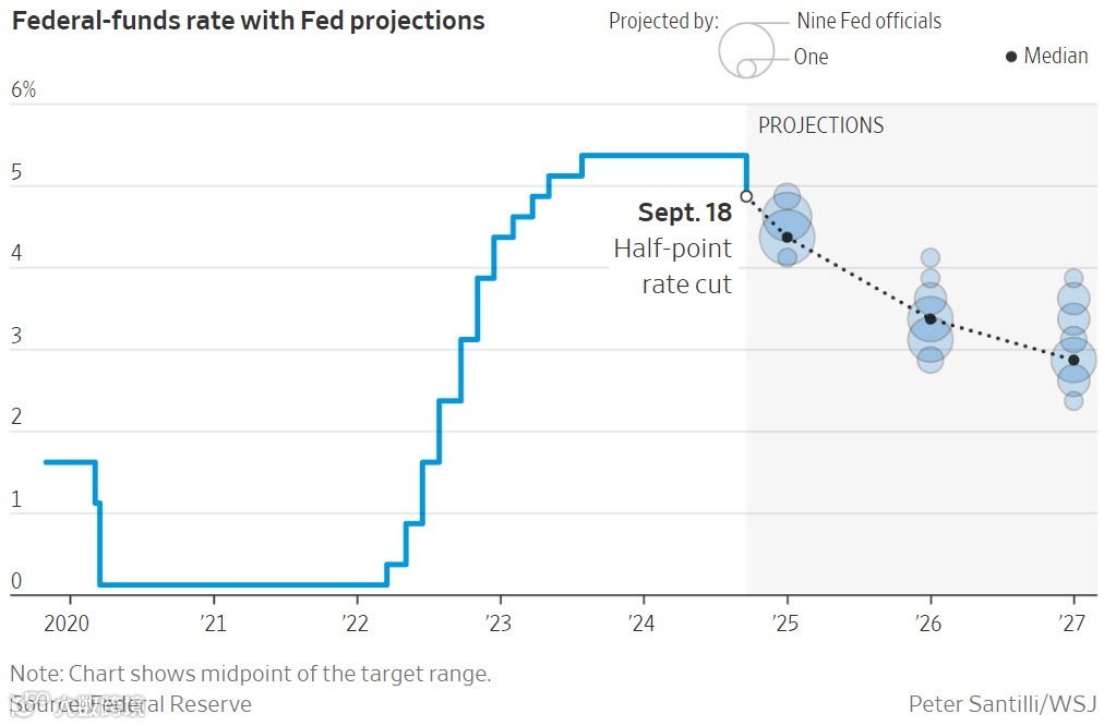 利率预测显示,假设失业率不上升且通胀率继续下降,官员们预计明年将再降息四次,每次降息1/4个百分点。这将使联邦基金利率到 2025 年底降至略低于 3.5% 的水平。