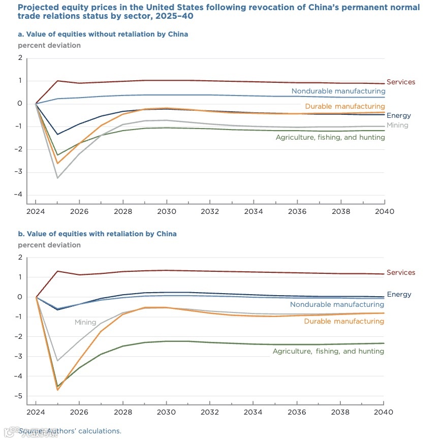 近年来,对中国贸易行为的担忧以及中国出口对美国制造业的影响加剧了美国政界的不满,要求取消中国PNTR的呼声日渐升高。报告基于G-Cubed模型(一个多国、多产业混合动态随机——可计算一般均衡模型)的分析表明,取消中国PNTR将导致美国国内通胀上升,并在短期内导致相对于基线的美国GDP下降。美国经济不同部门将在不同程度上感受到产出和就业缩减。农业、耐用品制造业和采矿业等受贸易影响最大的部门损失最大。股票市场价格将下跌,这会减少美国的产出并提高价格。如果中国报复,这些影响将被进一步放大。报告主要结论如下: