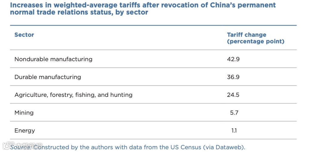 取消中国PNTR后的各行业加权平均关税的增加情况
