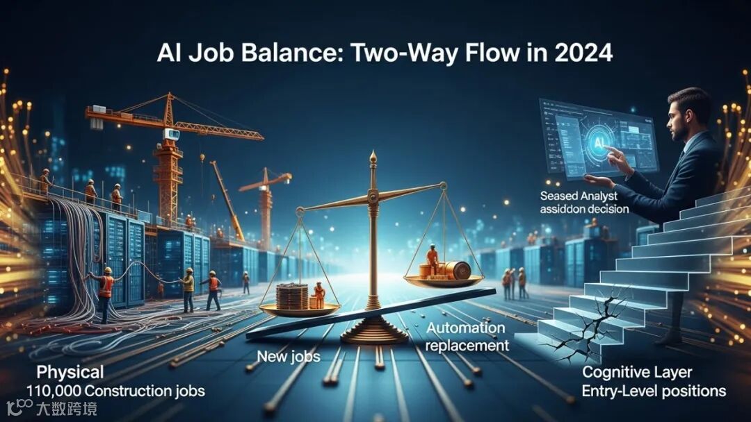 研究显示,2024年美国劳动力市场在AI领域的成熟过程中实现了显著的净就业增长:每消除一个职位,就会创造约十个新岗位。具体数据显示,AI在全美范围内直接创造了约119,900个工作岗位,而受其自动化影响减少的岗位仅为12,700个。这一比例揭示了AI革命当前正处于密集的“基础设施构建期”,其对算力、物理空间及模型精炼的需求,远超其在任务自动化中释放的效能。本文将深入分析这一范式的内在逻辑、结构性挑战以及职业角色的重塑。