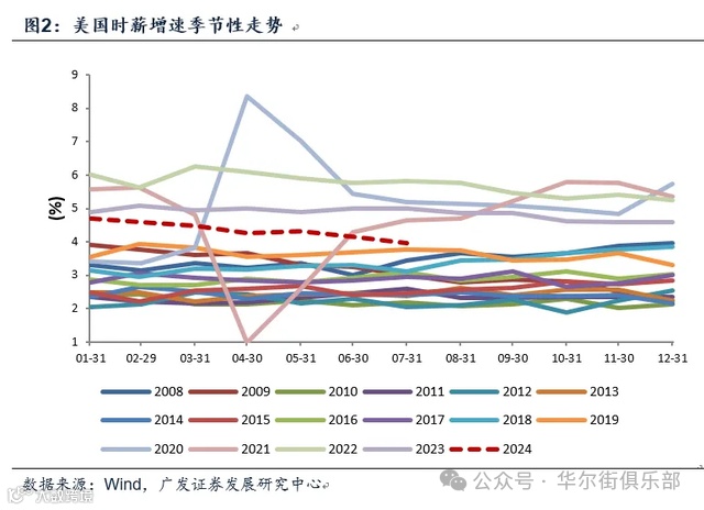 一是薪资增速位置。7月美国非农私人部门时薪增速同比3.6%,较年初的4.4%已有明显放缓,但仍高于2020年之前。对于“就业——薪资——消费——增长和通胀”这一链条来说,薪资是一个关键的中间变量。