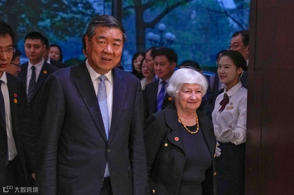 美国财政部长耶伦(右)和中国国务院副总理何立峰,2024年4月6日。图片来源:ANDY WONG/ASSOCIATED PRESS