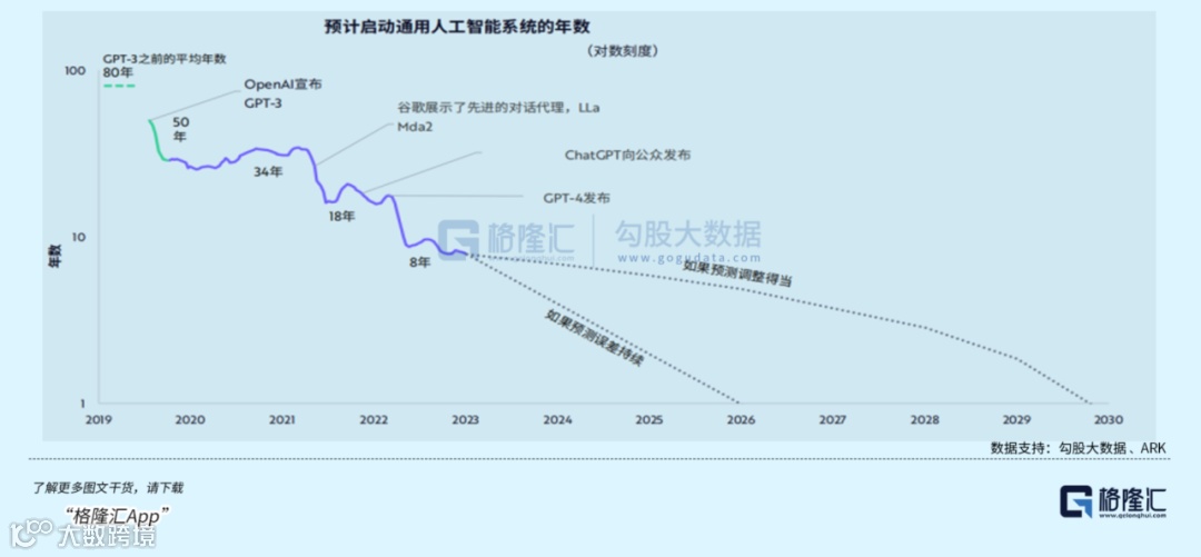 在2021年openAI发布chatGPT3.0版本时,木头姐的报告预计未来人类还要34年才能启动真正通用的AI系统。
