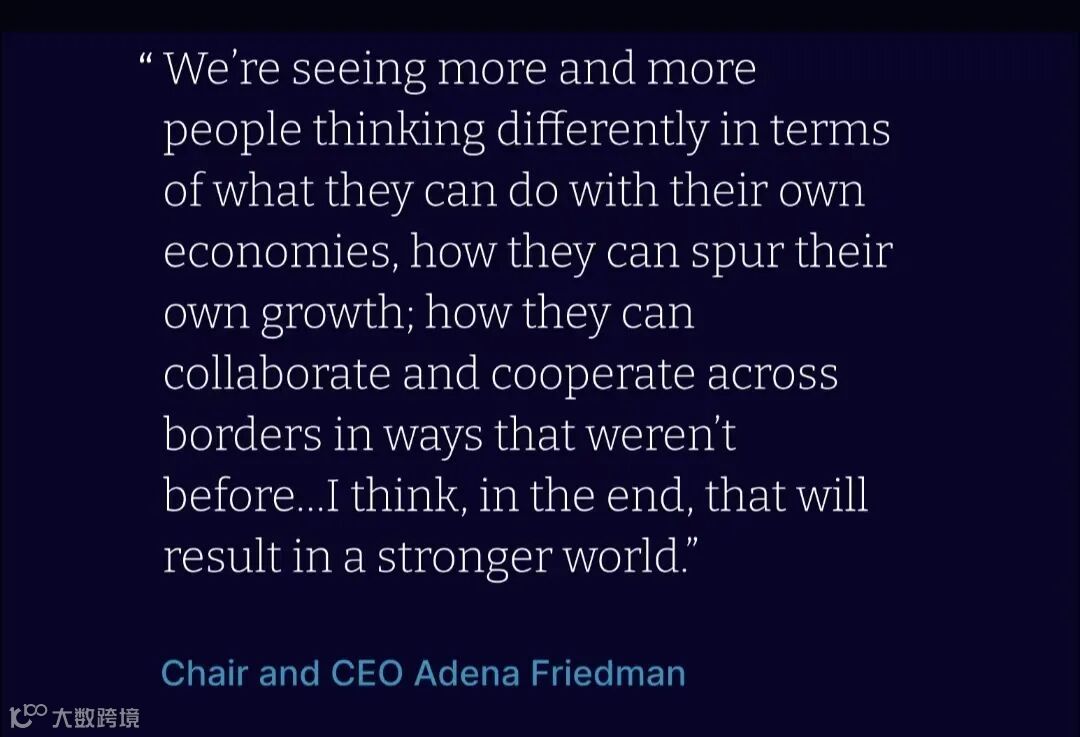 面对地缘政治波动与宏观政策转向,市场亟需清晰的信号与长期视角。纳斯达克主席兼CEO Adena Friedman在“全球经济辩论”(Debate on the Global Economy: Shaping Economic Policies Amid a Shifting Global Landscape)主题研讨上指出:自2024年初至今,纳斯达克100指数上涨47%,成分股企业盈利增长32%——这并非盲目乐观,而是投资者对结构性变革的理性定价。