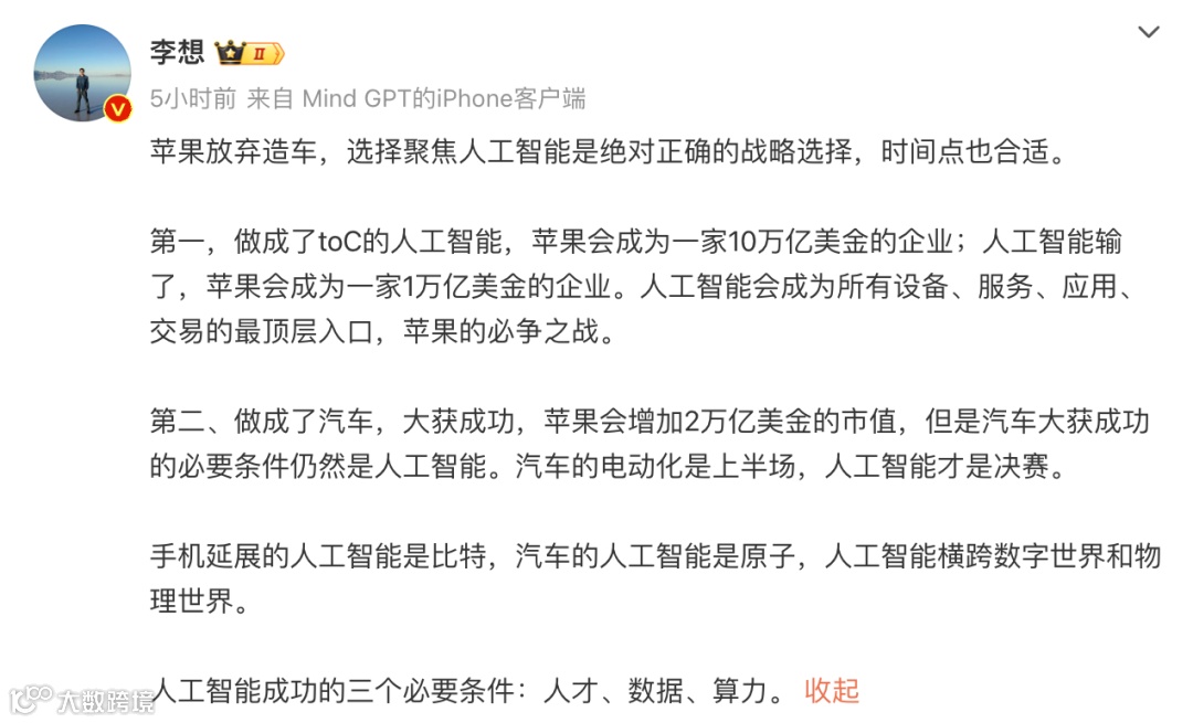 对于苹果放弃造车马斯克第一时间发表了看法,他在他的推文中发了一个致敬的表情和一支烟的表情。理想汽车董事长也很快发布了一则他的看法,他认为苹果放弃造车,选择聚焦人工智能是绝对正确的战略选择,时间点也合适。