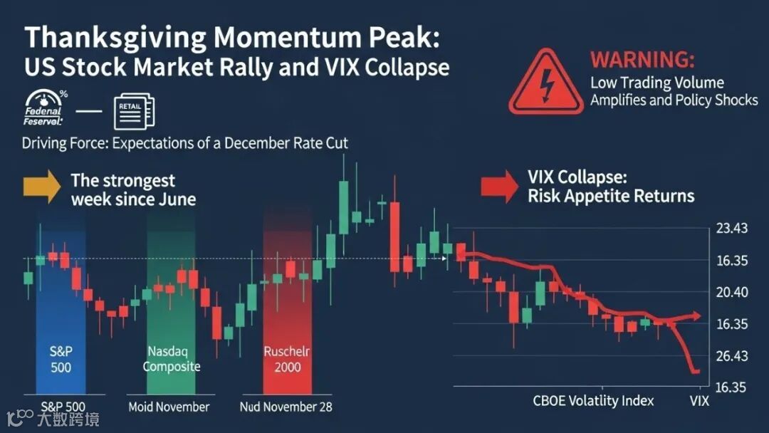 在2025年感恩节假期缩短的交易周(11月24日至28日)中,美国股市实现了自六月以来最显著的百分比涨幅,这一强劲反弹被定义为“感恩节动量顶点”。此次爆发性上涨明确扭转了月中围绕人工智能(AI)估值引发的市场担忧情绪。市场动量的主要催化剂是投资者对美联储在十二月会议上降息的普遍且日益增强的预期。这种乐观情绪伴随着市场恐慌指标——Cboe波动率指数(VIX)的快速崩塌,标志着市场风险偏好显著回归。