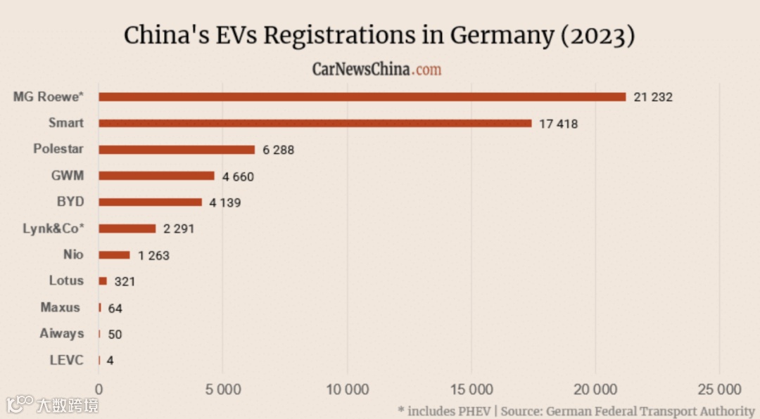 德国联邦交通局2023年中国品牌新能源汽车注册数据显示,在排除特斯拉后,中国新能源汽车在德累计新注册量为5.77万辆,但其中名爵、Smart和极星就贡献了超过4.4万辆,这些车型准确来说属于“合资品牌”。再将这些“合资品牌”排除后,纯中国汽车品牌销量仅为1.27万辆,对应的市占率约2.4%。