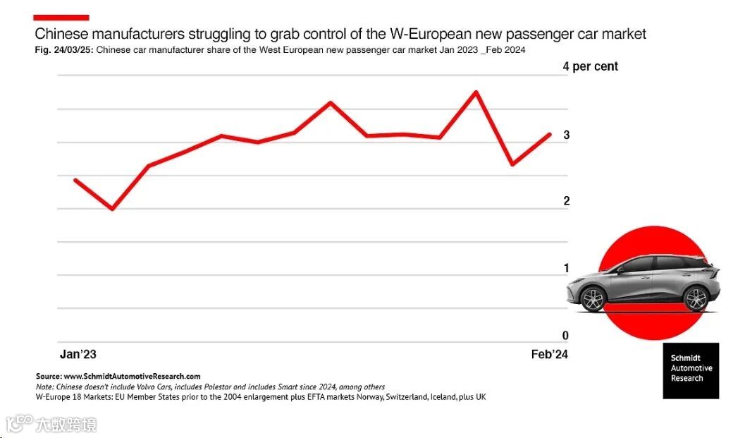 尽管在纯电动汽车市场,中国车企的市场份额相比以前有较大提升,但是根据Schmidt Automotive 3月25日发布的统计数据,今年1-2月,中国车企在西欧乘用新车市场的份额仍然难以突破3%,而同期日本原始设备制造商(OEM)占据了总市场的13.3%,韩国则占据了7.8%。